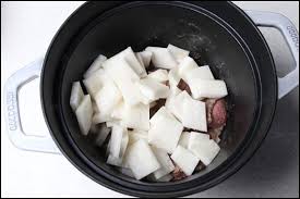1단계: 소고기는 키친타월로 핏물을 닦아내고, 무는 2~3cm 크기로 나박하게 썰어주세요. 대파는 어슷하게 썰어 준비합니다.