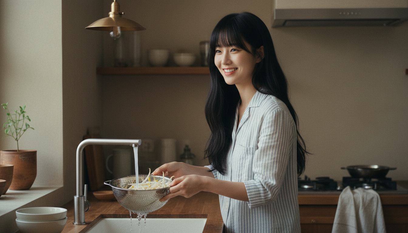 콩나물은 흐르는 물에 가볍게 흔들어 씻어주세요. 시들거나 상한 콩나물이 있다면 골라내고, 뿌리는 가급적 제거하지 않는 것이 좋아요. 뿌리에 영양분이 많이 들어있거든요. 단, 지저분한 끝부분만 살짝 다듬으면 됩니다.