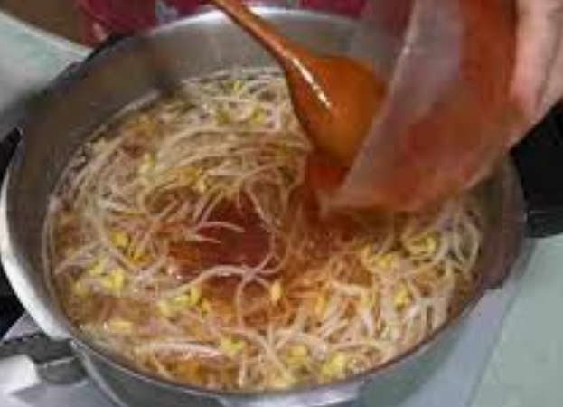 여기가 바로 콩나물국 맛있게 끓이는 법의 핵심이에요. 콩나물을 넣기 전에 육수에 먼저 밑간을 해주어야 해요. 다진 마늘과 참치액 또는 새우젓을 넣고, 국간장으로 기본 간을 맞춰주세요. 이렇게 하면 콩나물이 질기지 않고 부드럽게 익습니다.