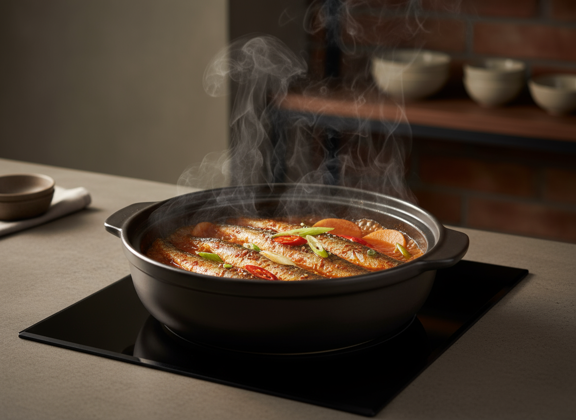 국물이 끓어오르면 불을 중약불로 줄이고, 숟가락으로 국물을 끼얹어 가며 10분 정도 더 조려주세요. 갈치 살이 부서질 수 있으니 절대 휘저으면 안 됩니다. 이것이 비린내 없는 갈치조림 맛있게 하는 법의 핵심 비결입니다.
