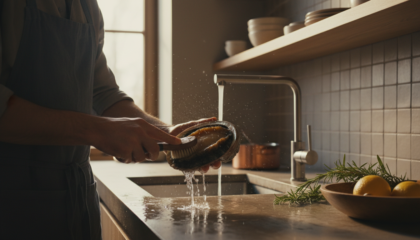 전복 손질은 생각보다 어렵지 않아요. 먼저 칫솔이나 요리용 솔로 전복 배 부분과 껍질을 깨끗하게 문질러 씻어주세요. 흐르는 물에 여러 번 헹궈 이물질을 완전히 제거하는 게 중요합니다.