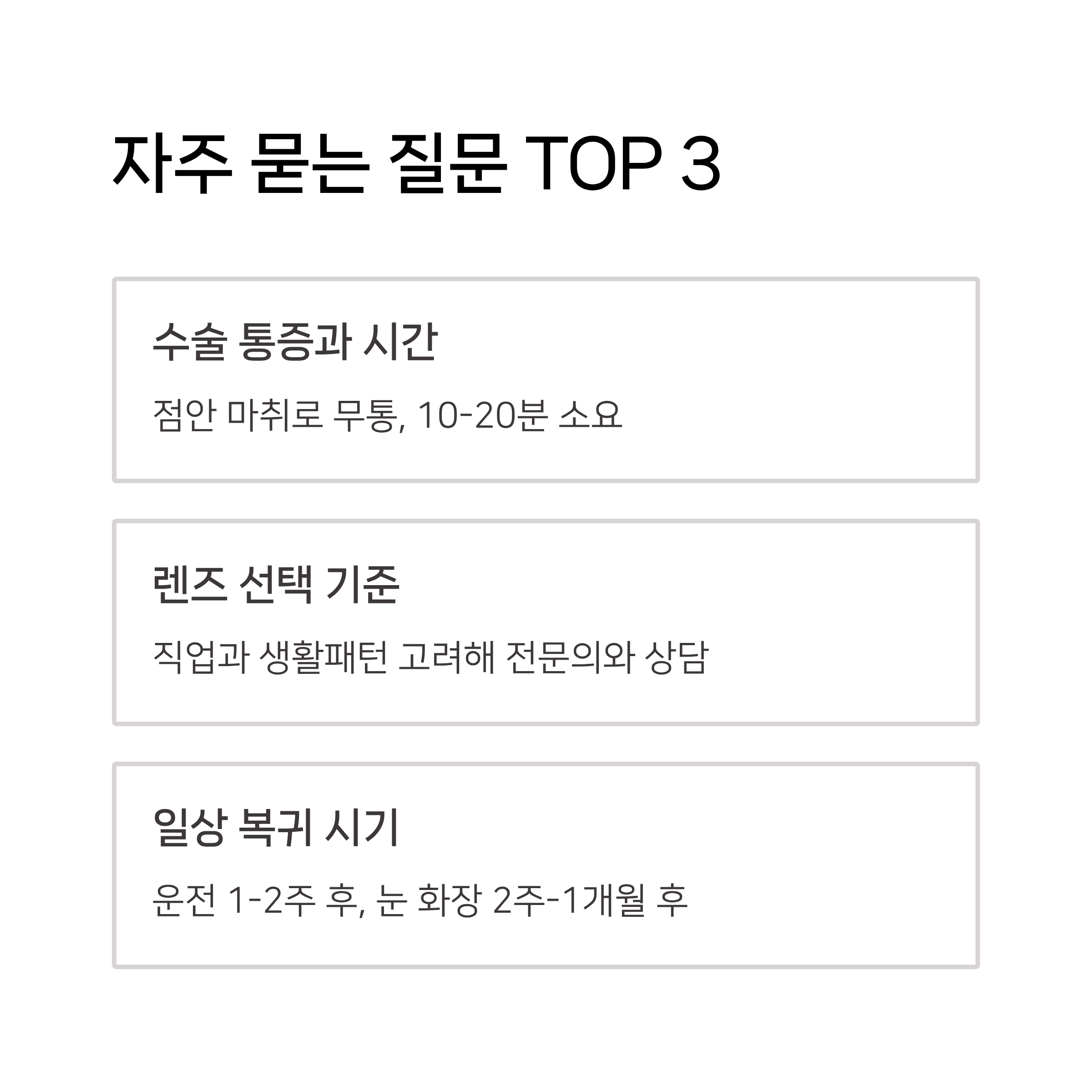 A: 수술 전 점안 마취를 하기 때문에 수술 중 통증은 거의 느껴지지 않습니다. 수술 시간 자체는 한쪽 눈에 약 10~20분 내외로 매우 짧은 편이며, 회복실에서 안정을 취한 후 당일 퇴원이 가능합니다.