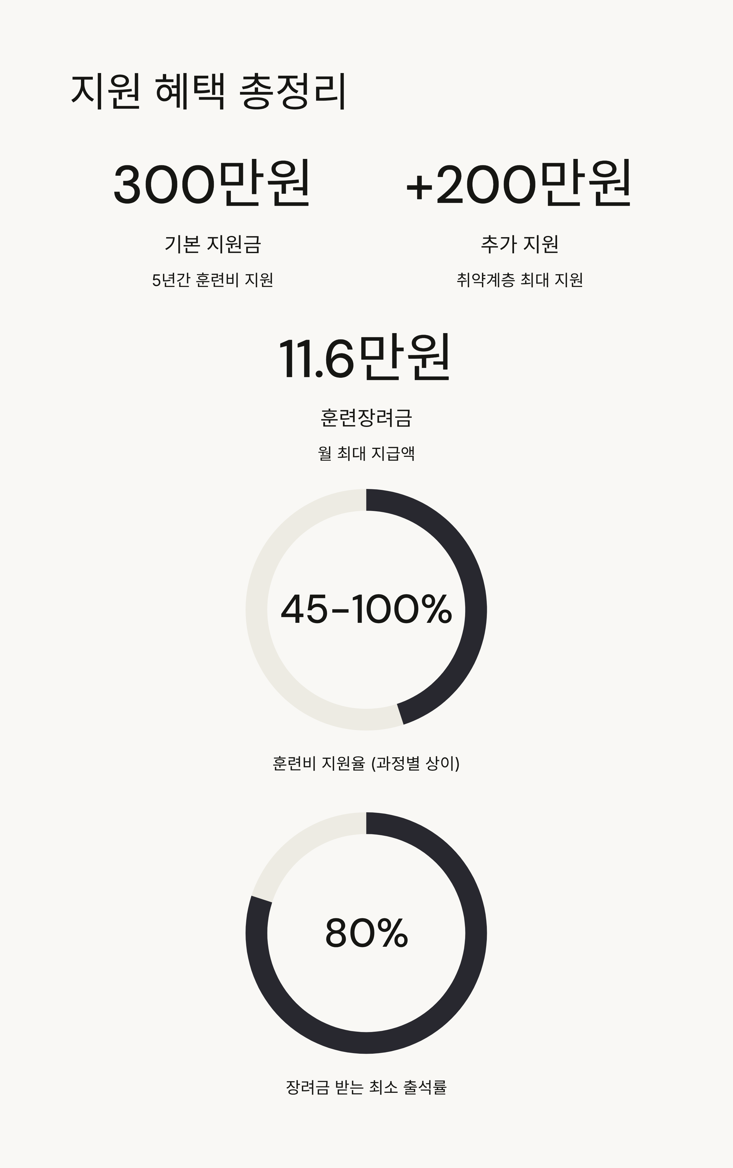 기본적으로 1인당 5년간 300만 원의 훈련비를 지원하며, 취약계층 등 특정 대상에게는 최대 200만 원까지 추가 지원됩니다. 훈련비 지원율은 과정의 취업률 등에 따라 45%~100%까지 달라지며, 일부는 자비부담금이 발생할 수 있습니다.