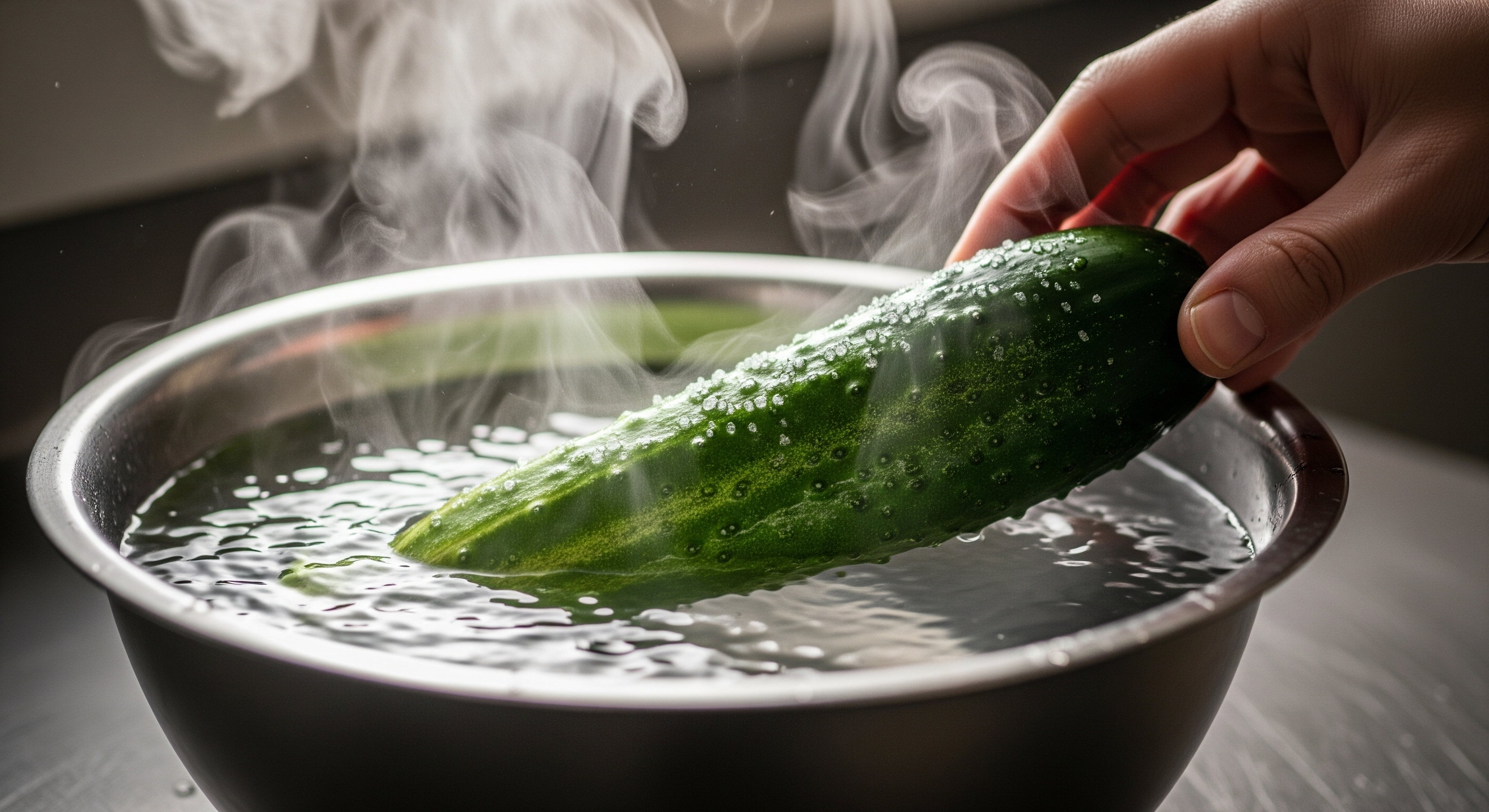 소금이 다 녹으면 손질한 오이에 뜨거운 소금물을 그대로 부어줍니다. '오이가 익는 거 아닐까?' 걱정하지 마세요! 이 방법이 오히려 오이의 수분을 효과적으로 빼주고 조직을 단단하게 만들어준답니다.