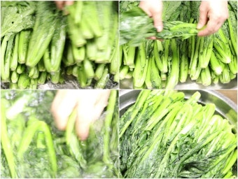 먼저 갓의 누런 잎은 떼어내고 뿌리 부분을 칼로 깨끗하게 정리해주세요. 줄기 사이사이에 흙이 끼어있을 수 있으니 흐르는 물에 여러 번 씻어줍니다. 줄기가 두꺼운 갓은 뿌리 부분에 열십자로 칼집을 내주면 소금이 잘 배어들어 고르게 절여집니다.