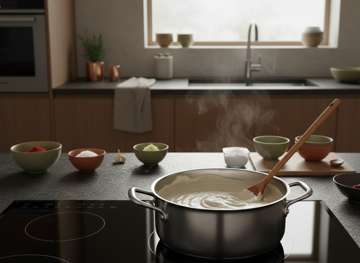 갓김치의 맛을 좌우하는 건 바로 양념입니다. 밀가루풀을 먼저 만들어야 하는데요. 물 500ml에 밀가루 8큰술을 풀어 약불에서 천천히 저으면서 끓여줍니다. 걸쭉하게 풀이 쑤어지면 식혀두세요.