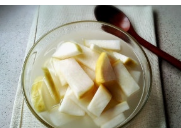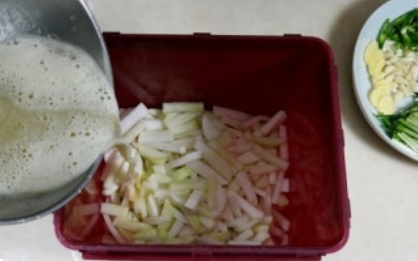 동치미는 조금 짜다 싶을 정도로 간을 해야 오래 두고 먹을 수 있습니다. 한꺼번에 소금을 많이 넣지 말고 조금씩 넣어가며 맛을 보세요. 나중에 먹을 때 짜면 물을 타서 마시면 됩니다. 찹쌀풀을 1/2컵 정도 넣으면 더욱 깊은 맛이 나요. ✅