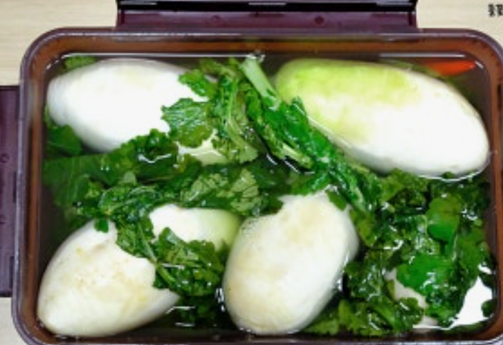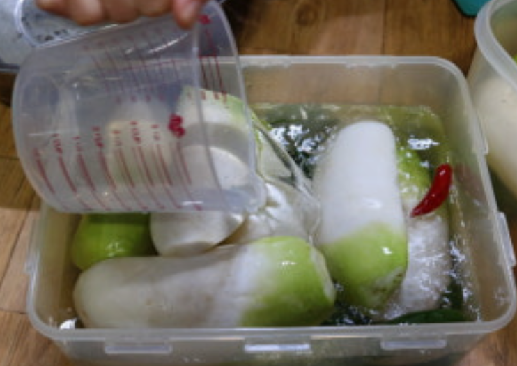 준비한 동치미 국물을 부어주고, 무가 뜨지 않도록 접시나 무거운 것으로 눌러줍니다. 실온에서 1~2일 정도 숙성시킨 후 김치냉장고로 옮겨주세요. 추운 베란다에서는 3~4일 정도 두면 됩니다. 김치냉장고에서 일주일에서 열흘 정도 더 숙성시키면 톡 쏘는 맛이 제대로 살아나요.