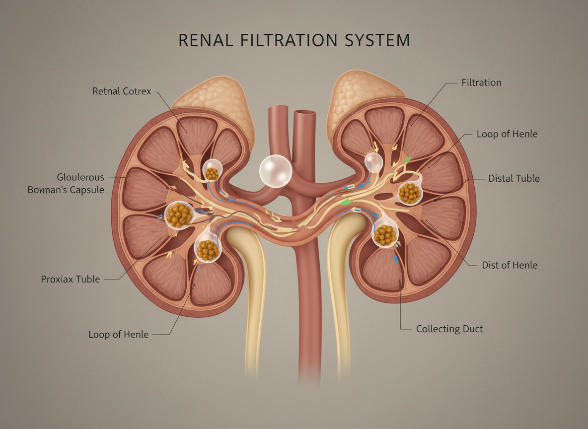 원래 우리 신장(콩팥)은 혈액 속 노폐물을 걸러내 소변으로 배출하고, 단백질처럼 몸에 필요한 성분은 다시 흡수하는 '필터' 역할을 합니다. 하지만 이 신장 필터(사구체) 기능에 문제가 생기면, 단백질이 소변으로 빠져나오게 됩니다.