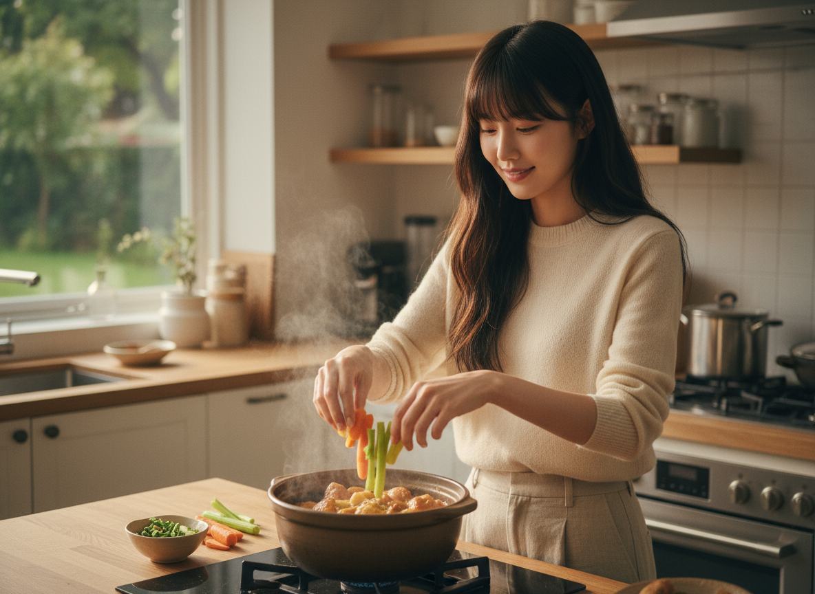 양파가 투명해지고 대파의 향이 올라오면 불을 끕니다. 뚜껑을 닫고 5분 정도 뜸을 들이면 재료들에 양념이 더 깊숙이 배어들어 훨씬 맛있는 닭볶음탕이 완성됩니다. 깻잎이나 쑥갓이 있다면 마지막에 넣어 향을 더해주는 것도 정말 좋습니다.