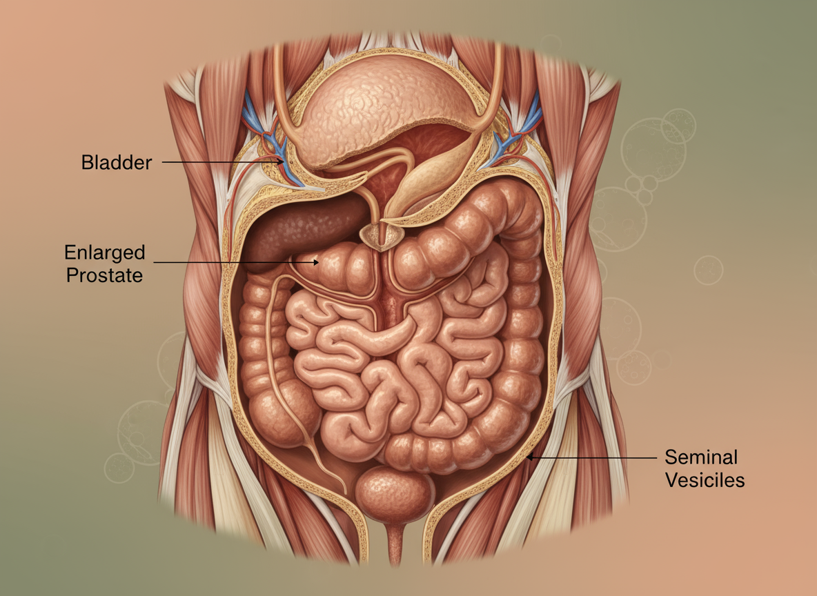 전립선은 방광 바로 아래에서 요도를 감싸고 있는 기관입니다. 이곳이 비대해지면 요도를 압박하면서 다양한 배뇨 장애가 나타나게 됩니다. 아래 증상들 중 해당되는 것이 많을수록 전립선비대증을 의심해 볼 수 있습니다. 💡