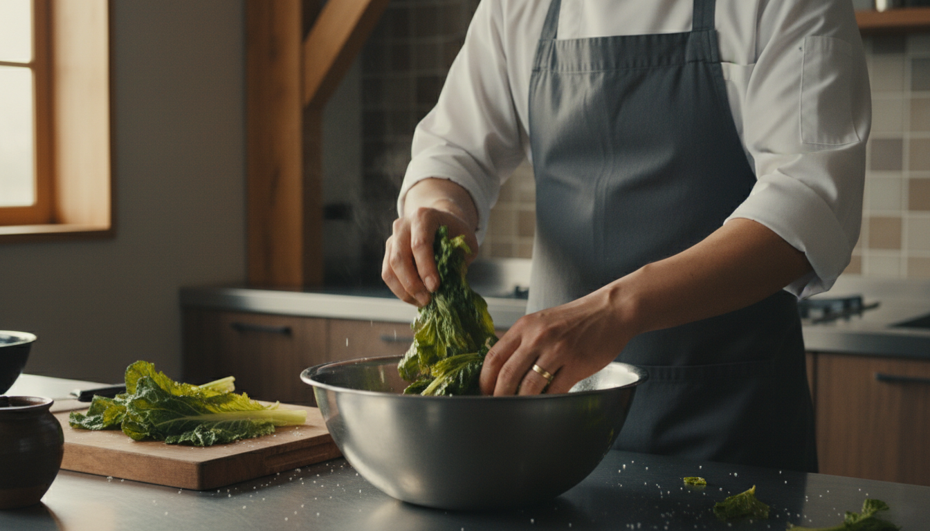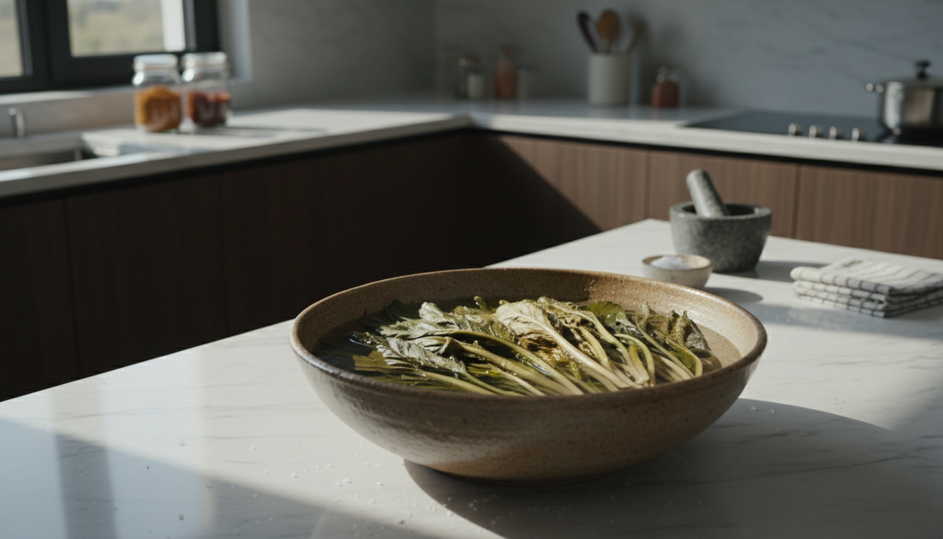 2시간쯤 지났을 때 위아래를 한 번 뒤집어 골고루 절여지게 합니다. 절인 갓은 맑은 물에 3번 정도만 가볍게 헹궈 물기를 완전히 빼주세요. 이 과정이 갓김치 맛있게 담그는법의 성공을 좌우합니다.