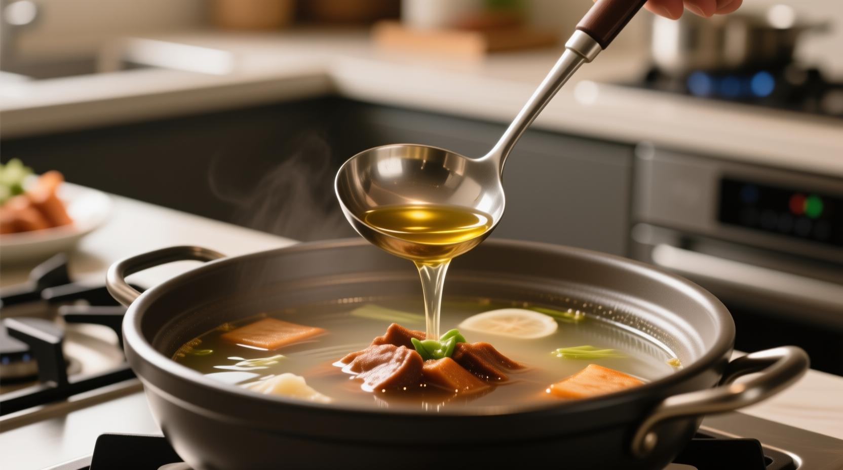 기름을 걷어낸 국물을 다시 한번 끓인 후 국간장과 액젓으로 기본 간을 하고, 모자란 간은 소금으로 맞춰주세요. 처음부터 소금으로만 간을 하는 것보다 국간장과 액젓을 함께 사용하면 감칠맛이 훨씬 풍부해집니다.