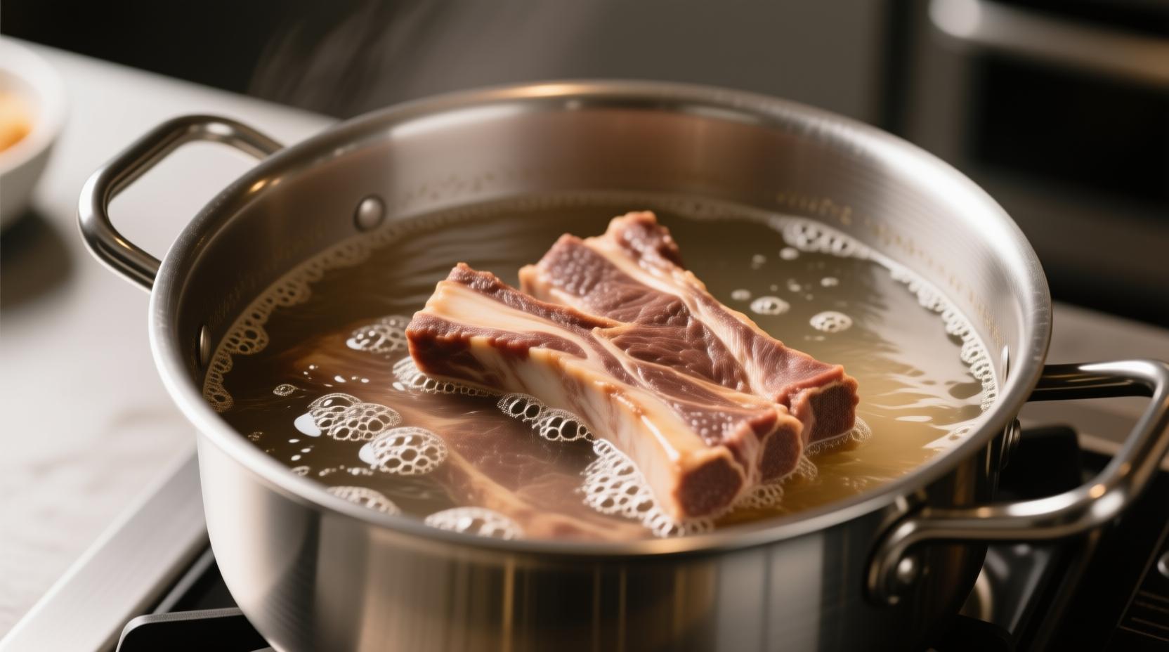 핏물 뺀 갈비는 끓는 물에 넣어 5~10분간 한번 데쳐주는 '애벌 삶기' 과정을 거칩니다. 이때 월계수 잎이나 소주를 살짝 넣어주면 남은 잡내를 잡는 데 도움이 됩니다.