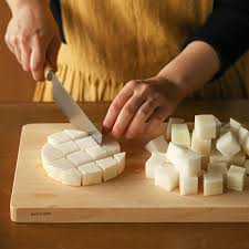 크기는 취향껏 하셔도 좋지만, 너무 작으면 금방 무르고 너무 크면 양념이 잘 배지 않으니 2~3cm 정도의 정육면체 모양을 추천합니다.